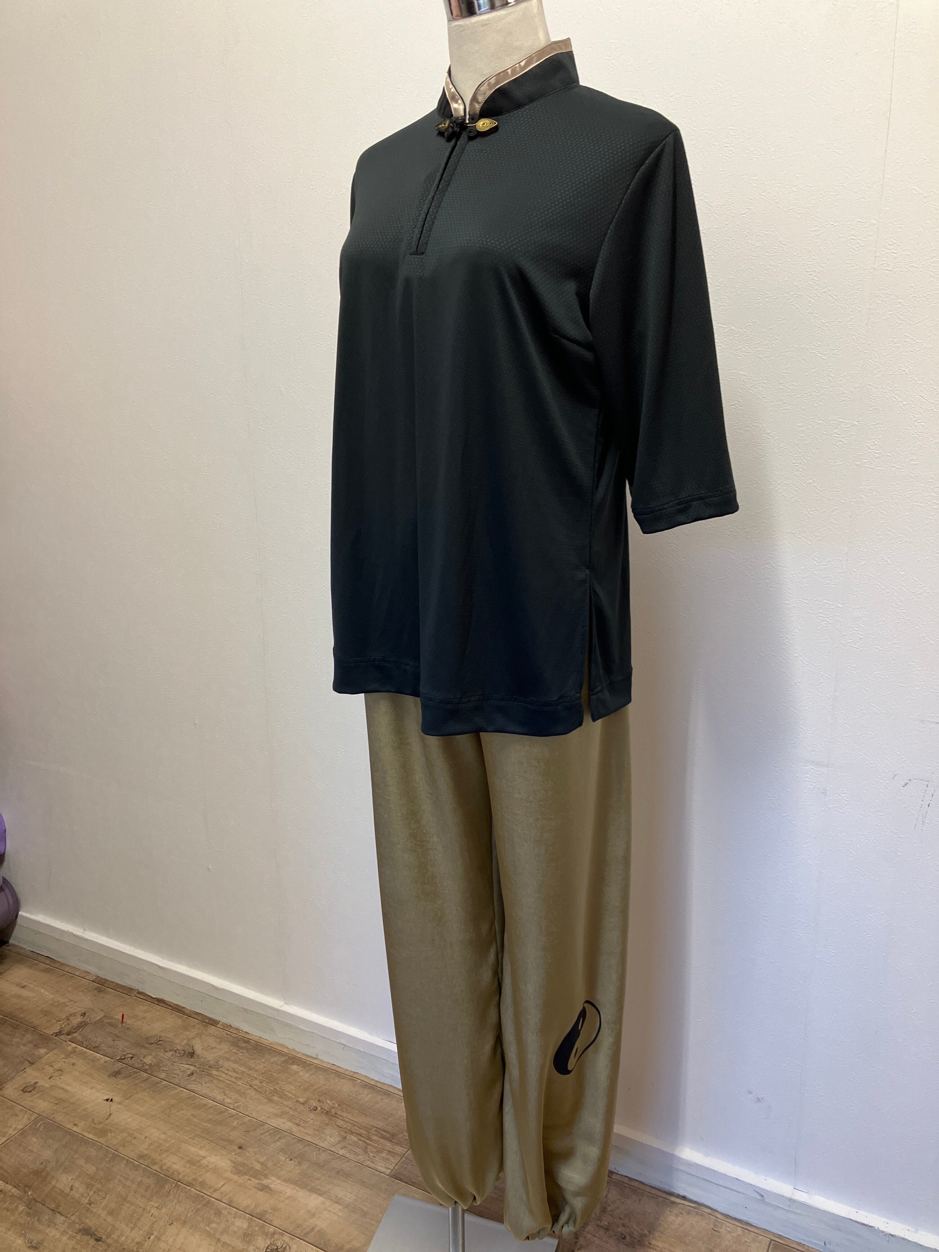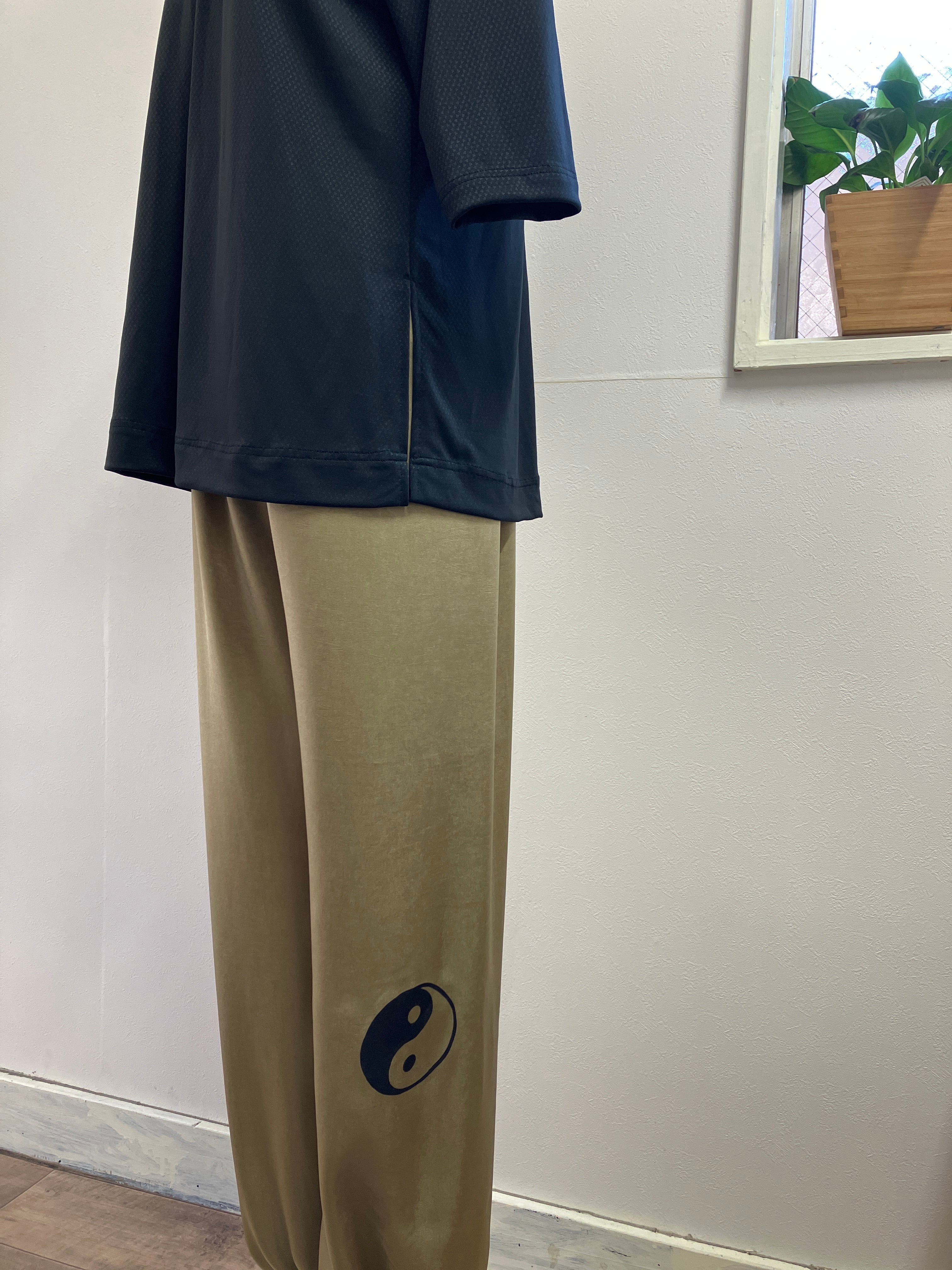 しっとりしたアイビー一番人気の生地にベンガラ染めで太極拳マークを染めたパンツです。